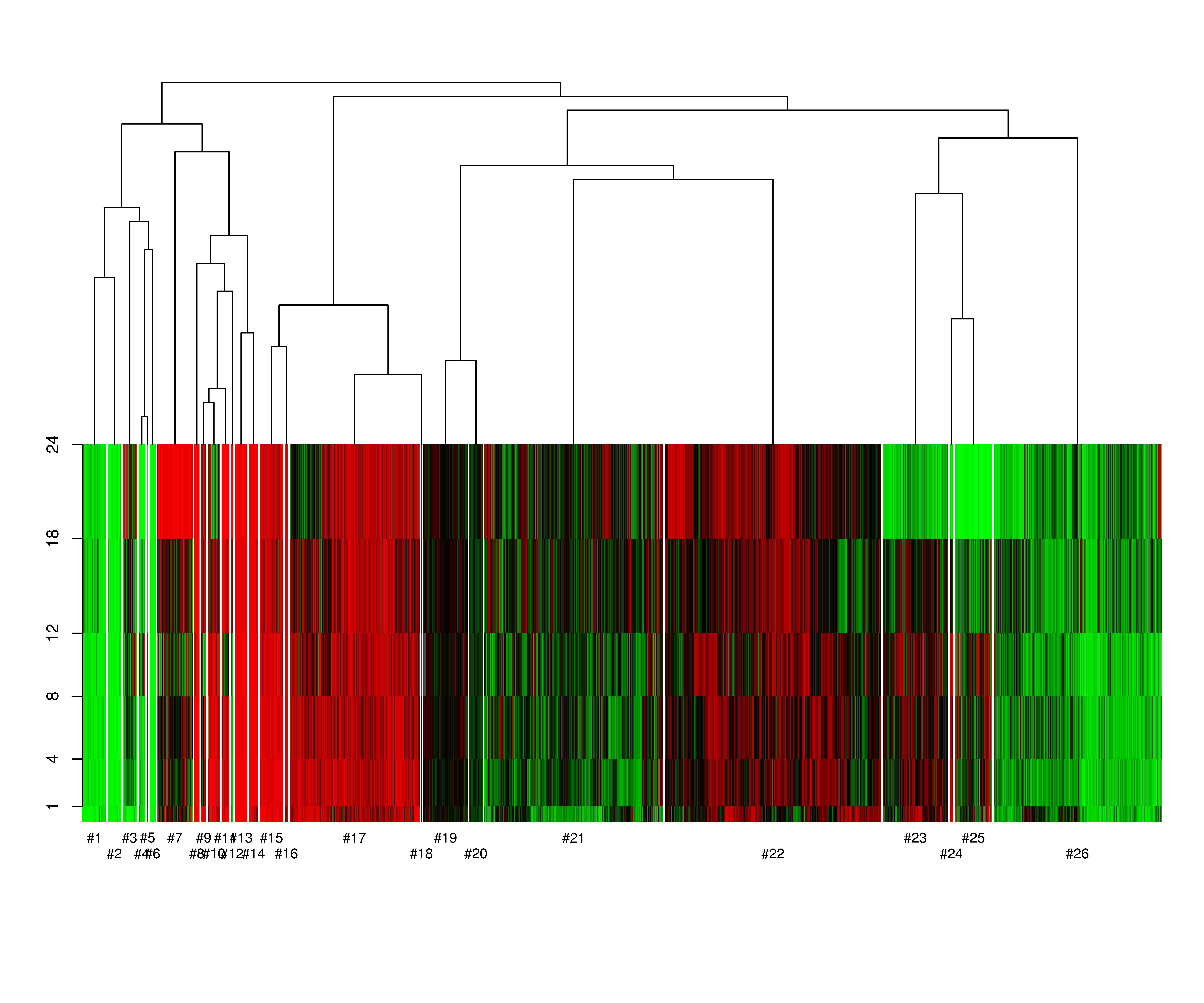 conditions for each of 2596 genes, taken at 6 identical, unequally spaced time points - 1hr,